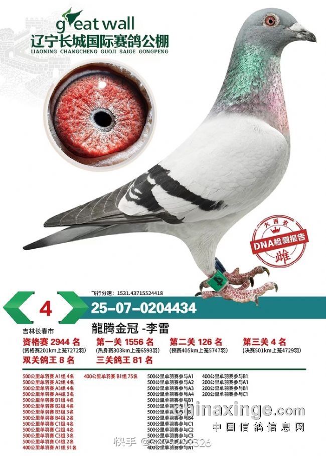 决赛4名是吉林长春鸽友龍腾金冠-李雷的一羽灰雌,环号25-07-0204434。这羽赛鸽的成绩更是可圈可点,资格赛2944名、一关1566名、二关126名、决赛4名,状态越来越好,一直在大步前进。最终获得了双关鸽王8名、三关鸽王81名。