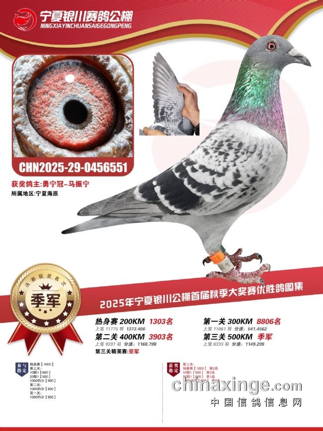 宁夏银川公棚决赛季军,由宁夏海原的鸽友勇宁冠-马振宁获得,赛鸽环号2025-29-0456551,这是鸽主唯一一羽交费鸽,获得热身赛1303名、一关8806名、二关3903名、决赛季军、精英赛亚军。