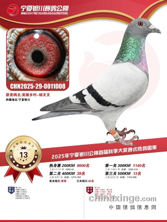 还有一羽成绩斐然的赛鸽,由鸽主美丽乡村-杨文文选送的唯一一羽交费鸽,环号2025-29-0011008。这羽赛鸽热身赛9000名、一关1140名、二关就猛猛发力拿下39名,决赛13名,获得双关亚军、三关20名。