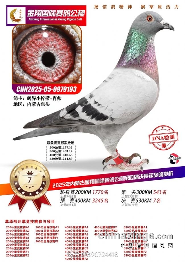 决赛7名,来自鸽界小柠檬+肖帅一羽环号为0979193的灰雌,四关成绩分别为一关1770、二关543、三关3245名、决赛7名。