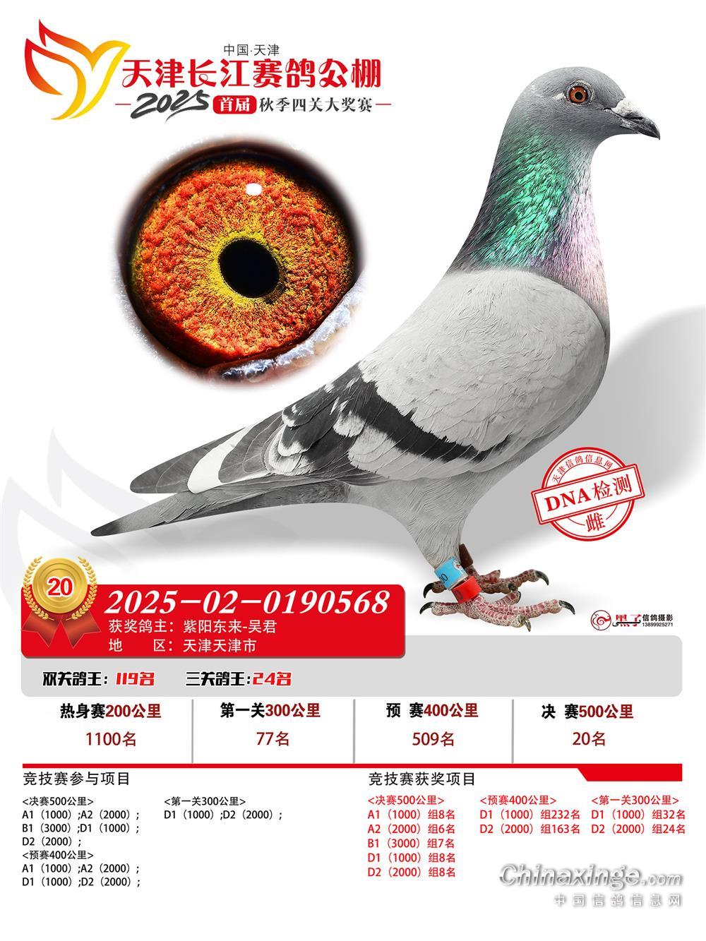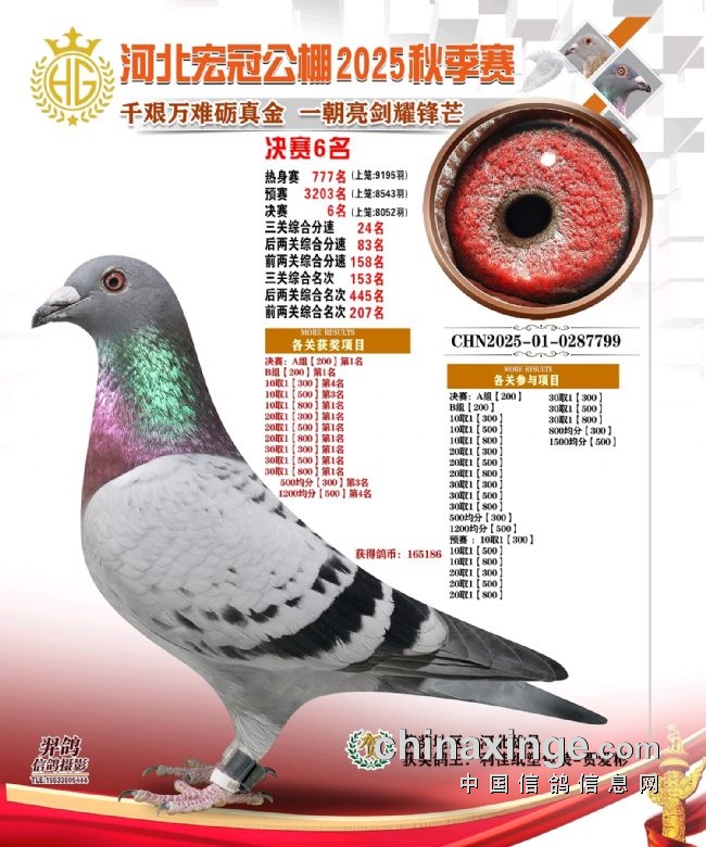 资格赛上笼9557羽,它拿下6069名;首关上笼8241羽,拿下5221名;二关上笼7698羽,拿下42名;决赛上笼6435羽,直接拿下决赛10名,获得双关鸽王亚军、区域冠军。