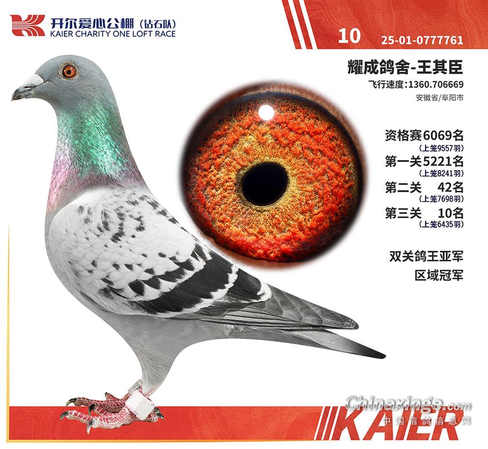 在开尔钻石队双关鸽王获奖名单中,耀成鸽舍-王其臣的成绩实在亮眼。这位来自安徽阜阳的鸽友,今年仅在开尔交鸽一羽雨点——环号01-0777761。想来是先探探路,检验自家血系成果。结果这羽小将硬气得很,一路过五关斩六将,在万羽比赛中硬生生劈开一条路: