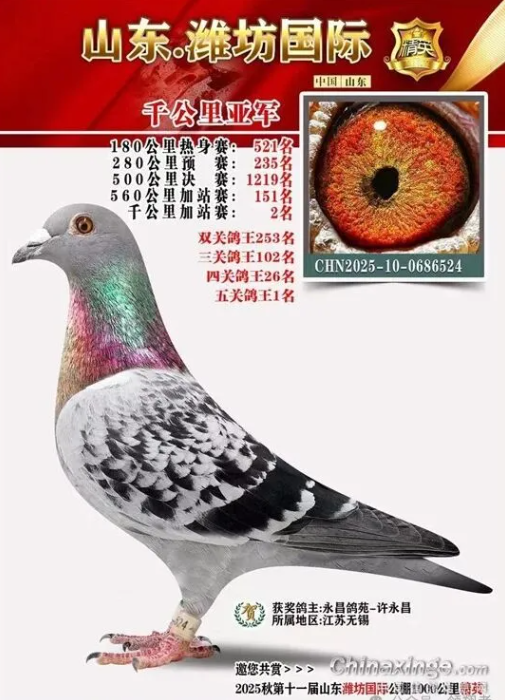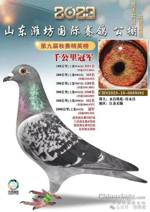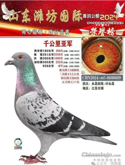 当山东维坊国际赛鸽公棚千公里比赛刚刚结束,便又收到江苏无锡鸽友许永昌老先生的喜报:在这场比赛中,他获得了亚军、8名、29名,参赛九羽归巢三羽的幼鸽千公里成绩。这一年他还获得了山东维坊国际赛鸽公棚500公里决赛殿军,有6羽鸽子飞进前三百名。