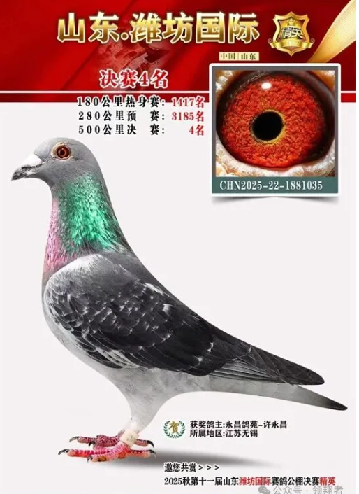 最后老爷子和我说:“无论飞得多么好,我用的都是‘李鸟’”!这句话和他2019年在江苏长江国际获得决赛冠军时说的一模一样。为了证明此言不虚,给我发来三张在山东维坊国际赛鸽公棚的获奖鸽照,有23年千公里冠军、五关鸽王亚军;24年千公里亚军、五关鸽王17位;25年千公里亚军、五关鸽王总冠军。”