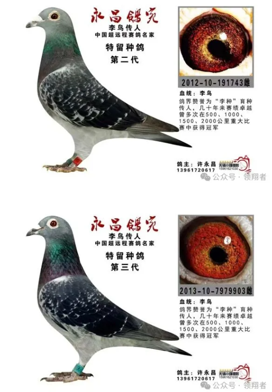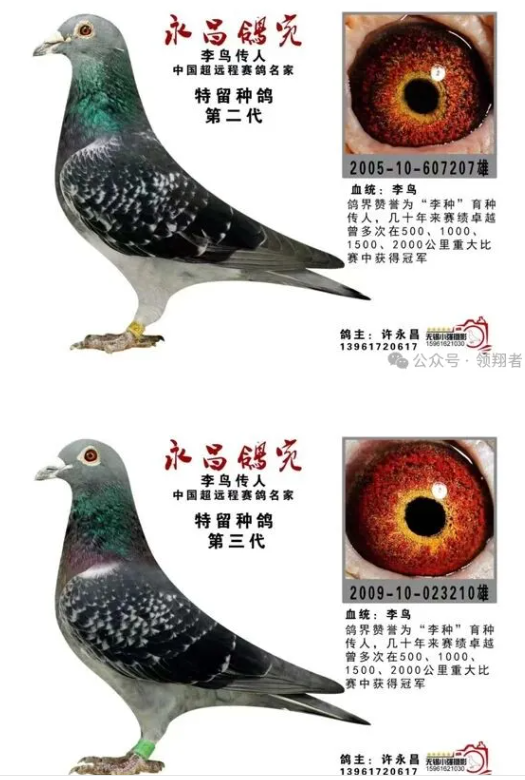 以许永昌为例,他以一羽“李鸟”繁衍作育,从1985年开始,获得过26个2千公里成绩,其中不乏冠亚季军等成绩,还有至今无人打破的千公里放15羽归15羽的满堂红记录。此外还有1990年亚运会冠军006162。1996年苏锡常与上海四市联翔近2万多羽的西安总冠军等长距离赛鸽成绩。从他鸽舍流传出去的“李鸟”更是获奖无数,比较有代表性的有山东济南沈生建获得过二千公里冠军、季军;哈尔滨杨国栋获得过2次1500公里冠军等等。