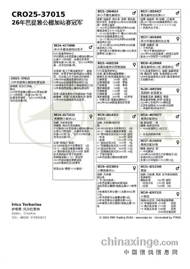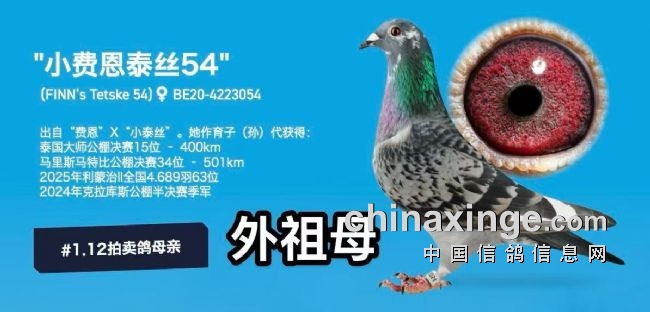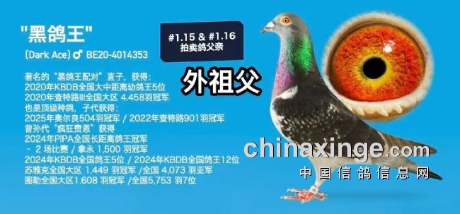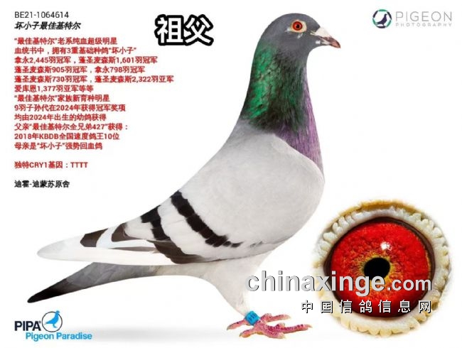 26年芭提雅公棚600公里加战赛4115羽冠军。 父亲为PIPA竞速育种中心原舍作育,出自“坏小子最佳基特尔”对“花最佳基特尔”同窝姐妹,母亲为汤姆·凡哈佛原舍,出自“黑鸽王”X“费恩小泰丝直女”。 …