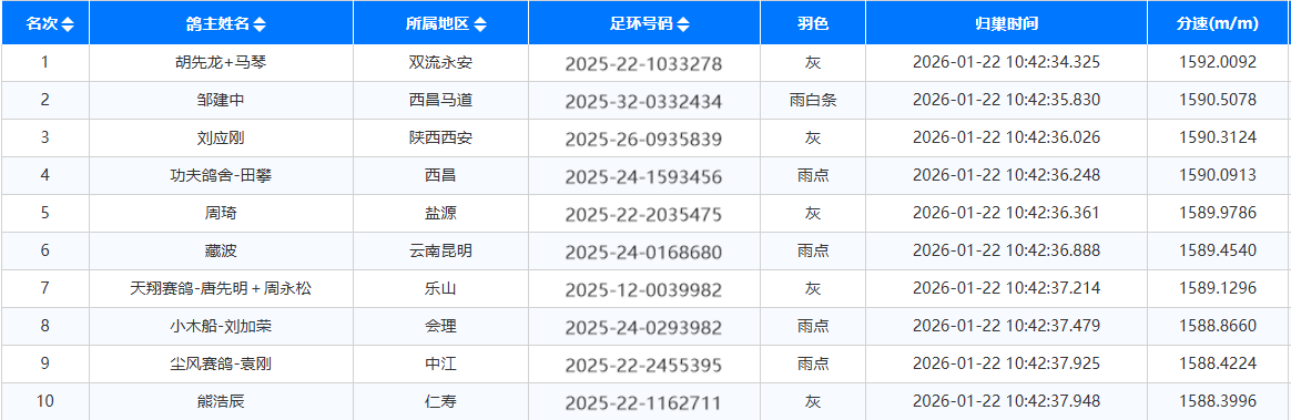 本次比赛上笼9617羽赛鸽,空距40公里。司放地天气晴,南风1级,气温3-19℃。今日小将们归巢速度飞快,半小时不到即见鸽。鸽友胡先龙+马琴的一羽2025-22-1033278灰鸽率先踩钟,分速1592.0092米/分,斩获冠军。鸽友邹建中的一羽2025-32-0332434雨白条随后报进,分速1590.5078米/分,获得亚军。鸽友刘应刚的一羽2025-26-0935839灰鸽获得季军,分速1590.3124米/分。截至上午11时08分,共有7772羽小将归巢,归巢率已达80.82%,期待更多小将归来。