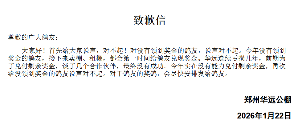 1月22日傍晚,郑州华远公棚发布公告,向未领取到奖金的鸽友道歉,表示公棚连年亏损,无能力兑付剩余奖金,后续将采取卖棚、租棚的方式兑付奖金。(点击查看公告)