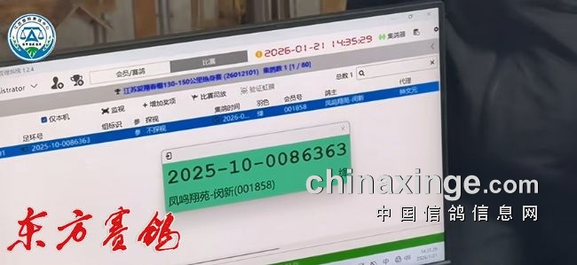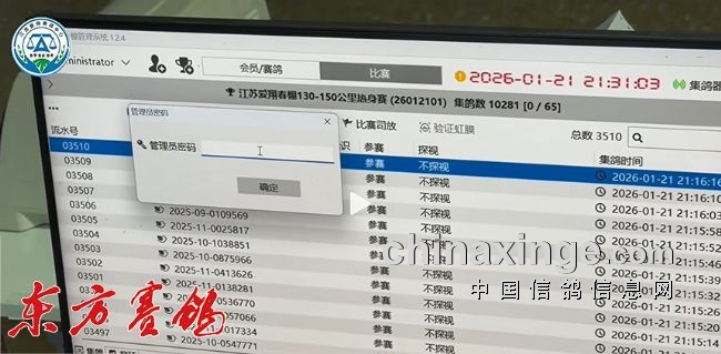 集鸽:1月21日集鸽,由泰州市信鸽协会裁判组执裁。集鸽从14:26:06开始,以逐羽扫描上笼,至21:16:16结束,剔除伤残鸽167羽,实际上笼10281羽。