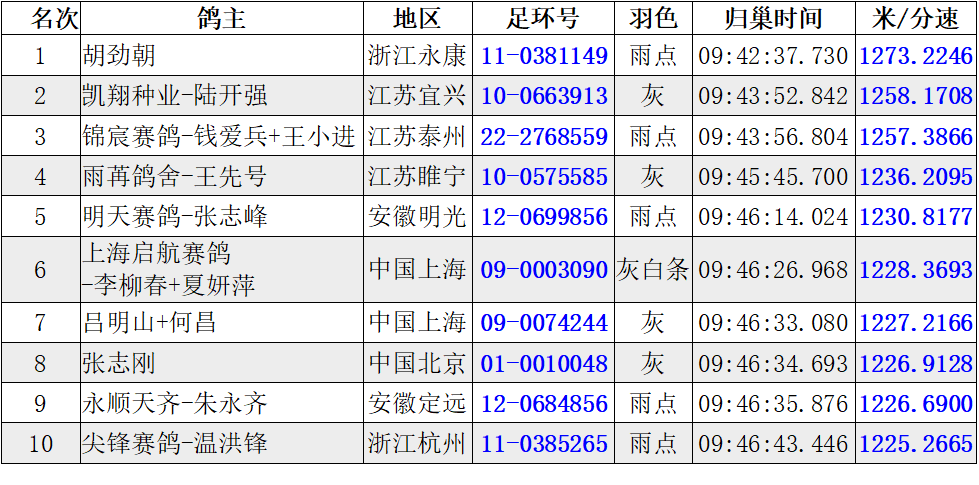 浙江永康胡劲朝麾下11-0381149雨点于09:42:37.730归巢,以1273.2246米/分夺得冠军。