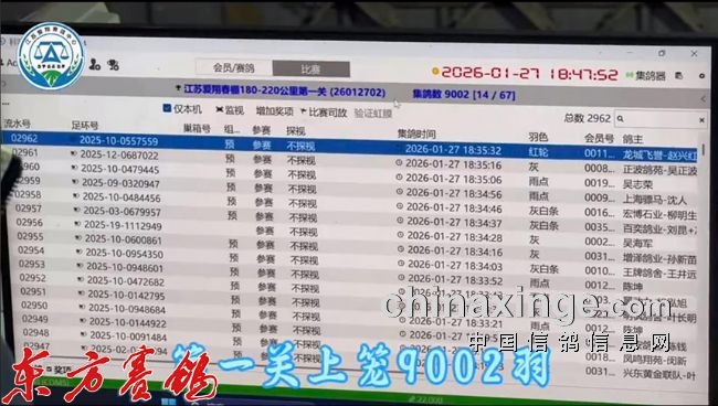 集鸽:1月27日集鸽,由泰州市信鸽协会裁判组执裁。集鸽从14:16:07开始,至18:35:32结束,经逐羽扫描上笼计9002羽。130—150公里热身赛获6、16、26、36、46、56名的鸽友作为会员代表参与集鸽扫描、上笼、放飞直至归巢全部赛事。