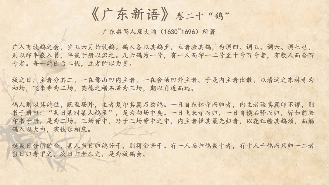 在四百年前岭南夏日的晨光里,一群灰羽信鸽振翅腾空,从百里之外的山寺飞回家中。它们不是传书报平安的驿使,而是参加一场由广东佛山放鸽会组织的一场竞技比赛。这项运动最早被清初学者屈大均郑重记入《广东新语》,不仅是中国最早有记录的信鸽竞赛制度,更可能是世界范围内有明确文献记载的首个民间信鸽组织。