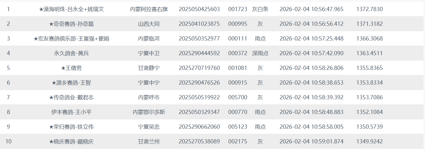 2个多小时后,第一梯队陆续归来。来自★漠海明珠-吕永全+姚瑞文的2025050425603灰白条报进,以1372.7830米/分的速度拿下冠军。接着,★奇奇赛鸽-孙奇磊的2025041023875灰鸽报进,以1371.3182米/分的速度获得亚军;★宏友赛鸽俱乐部-王富强+翟娟的2025050352977雨点报进,以1366.3068米/分的速度摘得季军。