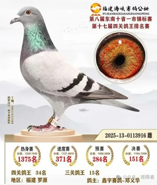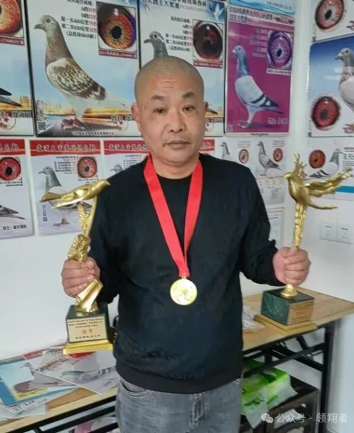 郑义华,福建罗源鸽友,2025年福建海峡赛鸽公棚决赛大团体冠军得主。在这一场比赛中,他凭借四羽入赏鸽的战绩,还获得了小团体殿军、四关鸽王殿军、东南九省一市信鸽公棚锦标赛个人奖、福建省信鸽协会“金翼奖”,总计收获了两座奖杯、三块金牌,成为2025年福建海峡公棚大赛场中的一位佼佼者。
