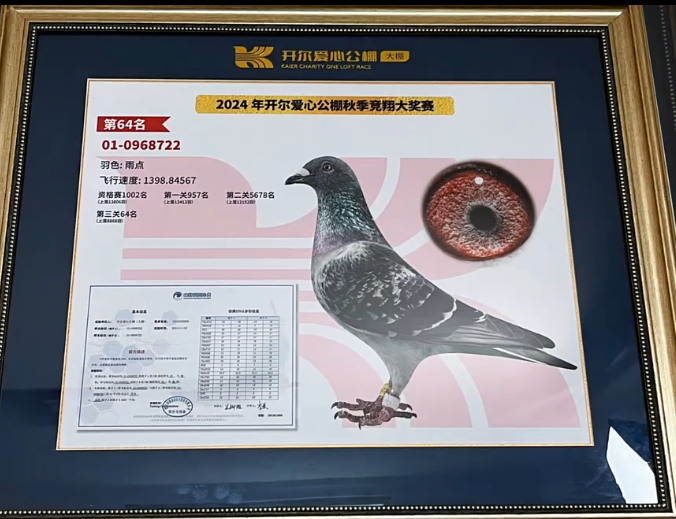 这鸽子现在,曾孙代都在飞。这个配对的孙代飞的开尔决赛10名、精英赛的亚军。今年春赛,这孙代决赛飞了一个300多名,就是10名的平辈。去年秋天也是飞了一个300多名,也是这10名的平辈。