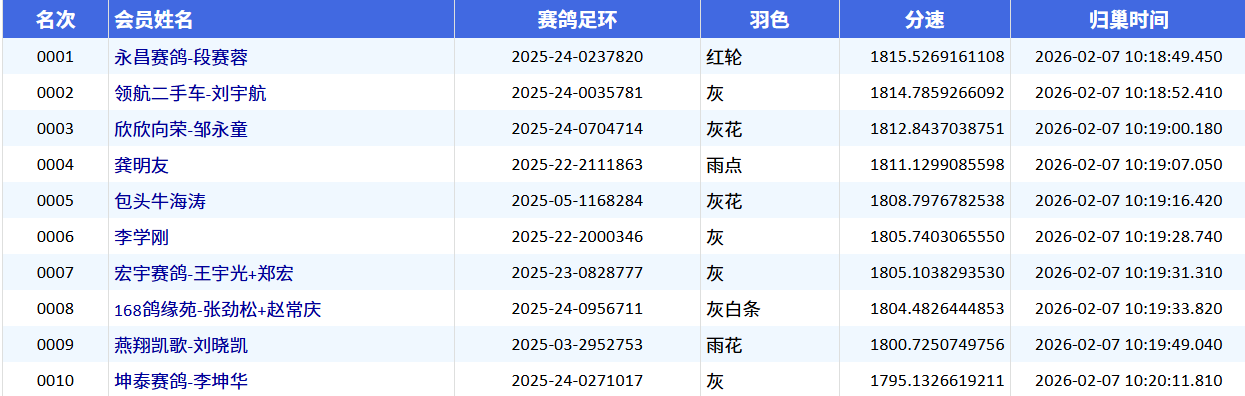 仅仅两小时,大批赛鸽陆续归巢。上午10时18分49秒,永昌赛鸽-段赛蓉的一羽红轮率先归巢,环号2025-24-0237820,分速1815.5269米/分,获得冠军。