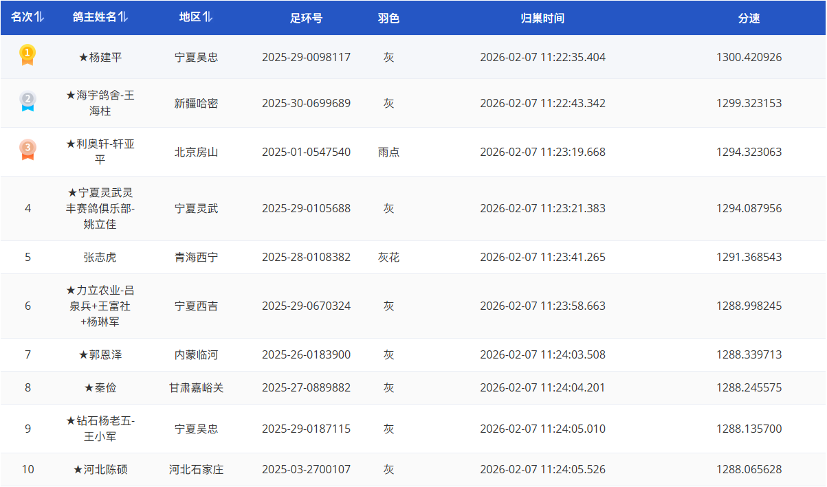 除此之外,宁夏塞上江南春棚在2月8日迎来热身赛的比拼。上午8时47分,宁夏塞上江南赛鸽公棚180公里热身赛在盐池麻黄山开笼放飞,集鸽9747羽,参考空距183.0220公里。10时35分38秒,红蓝战队-任建国的灰鸽2025290662641率先归巢,以1684.7125米/分的分速夺冠。建翔巨匠-刘建军的雨点鸽2025032534446获得亚军,分速1673.5156米/分。星起点-马麒的麒麟花鸽2025270017124,以1631.5395米/分的分速拿下季军。截至开笼第二日上午9时15分,共4012羽赛鸽归巢,归巢率41.16%。比赛直播