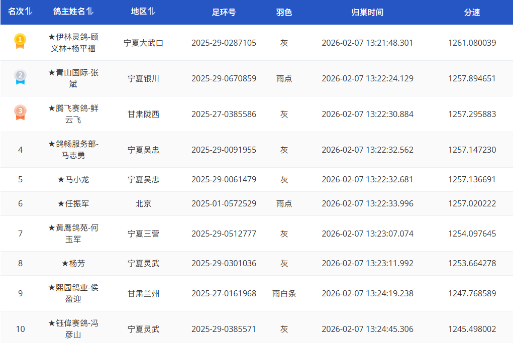 上午9时26分,宁夏赛航春棚第一关在甘肃宁县开笼放飞,比赛集鸽10970羽,参考空距300公里。13时21分48秒,伊林灵鸽-顾义林+杨平福的灰鸽2025-29-0287105率先归巢,以1261.0800米/分的分速斩获冠军。青山国际-张斌的雨点鸽2025-29-0670859,分速1257.8946米/分,斩获亚军。腾飞赛鸽-鲜云飞的灰鸽2025-27-0385586,以1257.2958米/分的分速拿下季军。截至第三日上午9时,共归巢7937羽赛鸽,归巢率72.4%。比赛直播