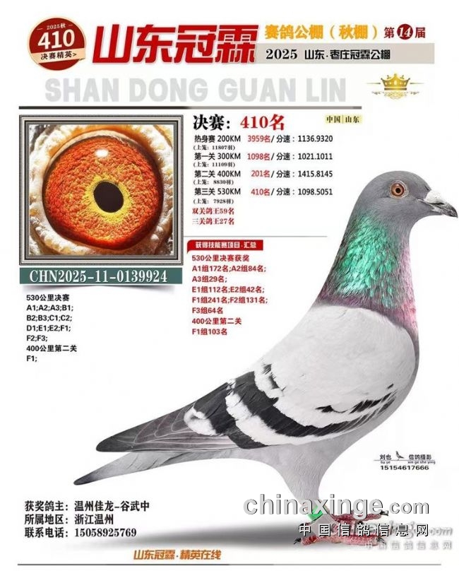 (青岛金胶洲公棚决赛132名、300公里20名、同窝山东快鸟公棚决赛410名、300公里164名)