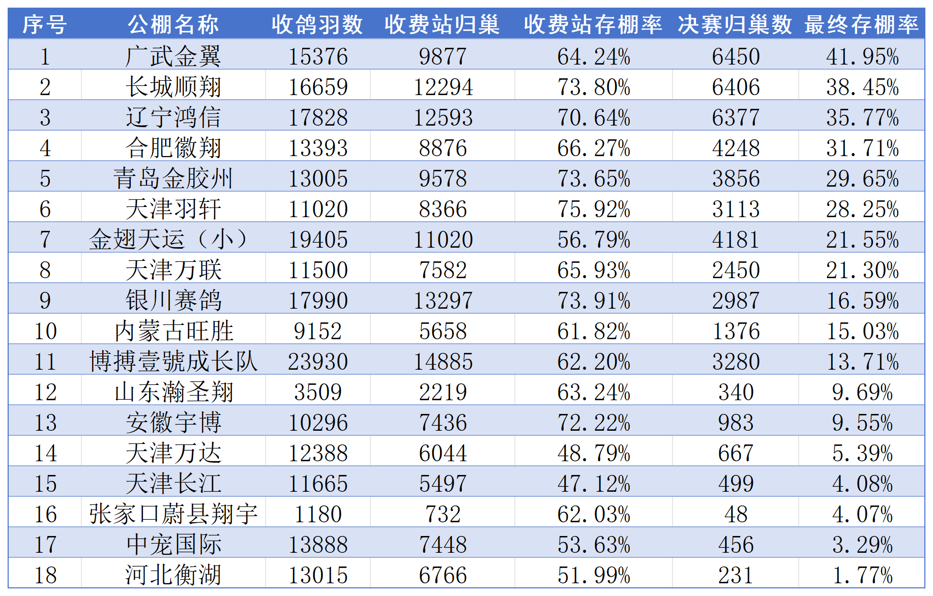 其中,最高最终存棚率出自广武金翼公棚,约41.95%,收鸽15376羽,决赛归巢6450羽;长城顺翔、辽宁鸿信紧随其后,最终存棚率分别达38.45%、35.77%,且两家收鸽均超1.6万羽。而河北恒湖最终存棚率1.77%,天津长江、中宠国际等不足5%,虽然存棚率有较大差距,但这也是公棚在经验积累过程中出现的正常现象,并非实力层面的绝对差距。