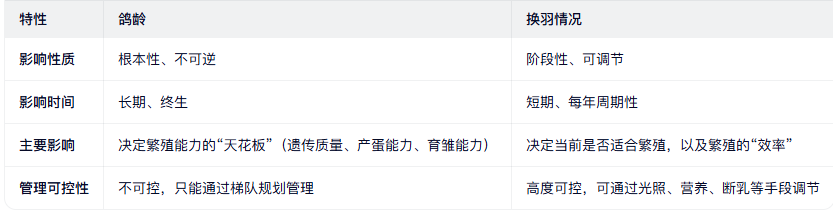 总体上,鸽龄对繁殖能力的影响是根本性和决定性的,而换羽情况更多是阶段性和管理性的影响。两者都很重要,但鸽龄才是基础。