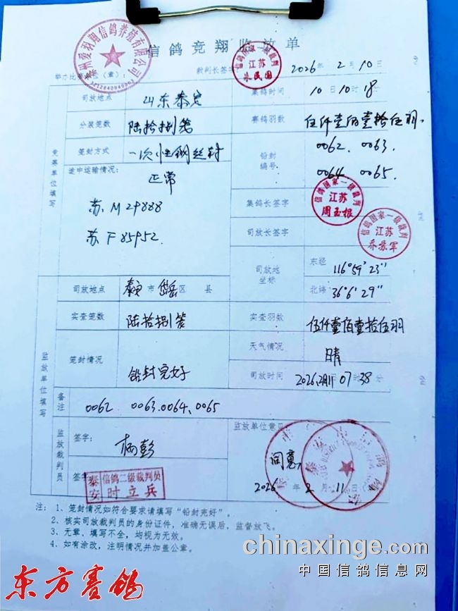 2月11日早上07:38,江苏爱翔赛鸽中心春棚2026年首届春赛第三关500公里决赛,在山东泰安擂响战鼓,实际空距500.638公里。5115羽爱翔战将巅峰对决,争夺决赛的各大奖项。