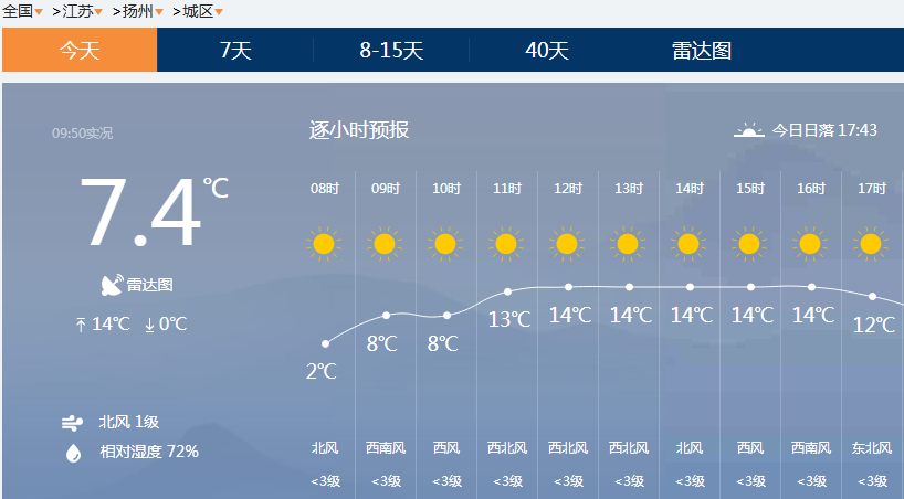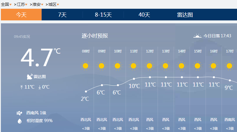 淮安地区,11点西北风1级,12点北风1级,13点北风2级。