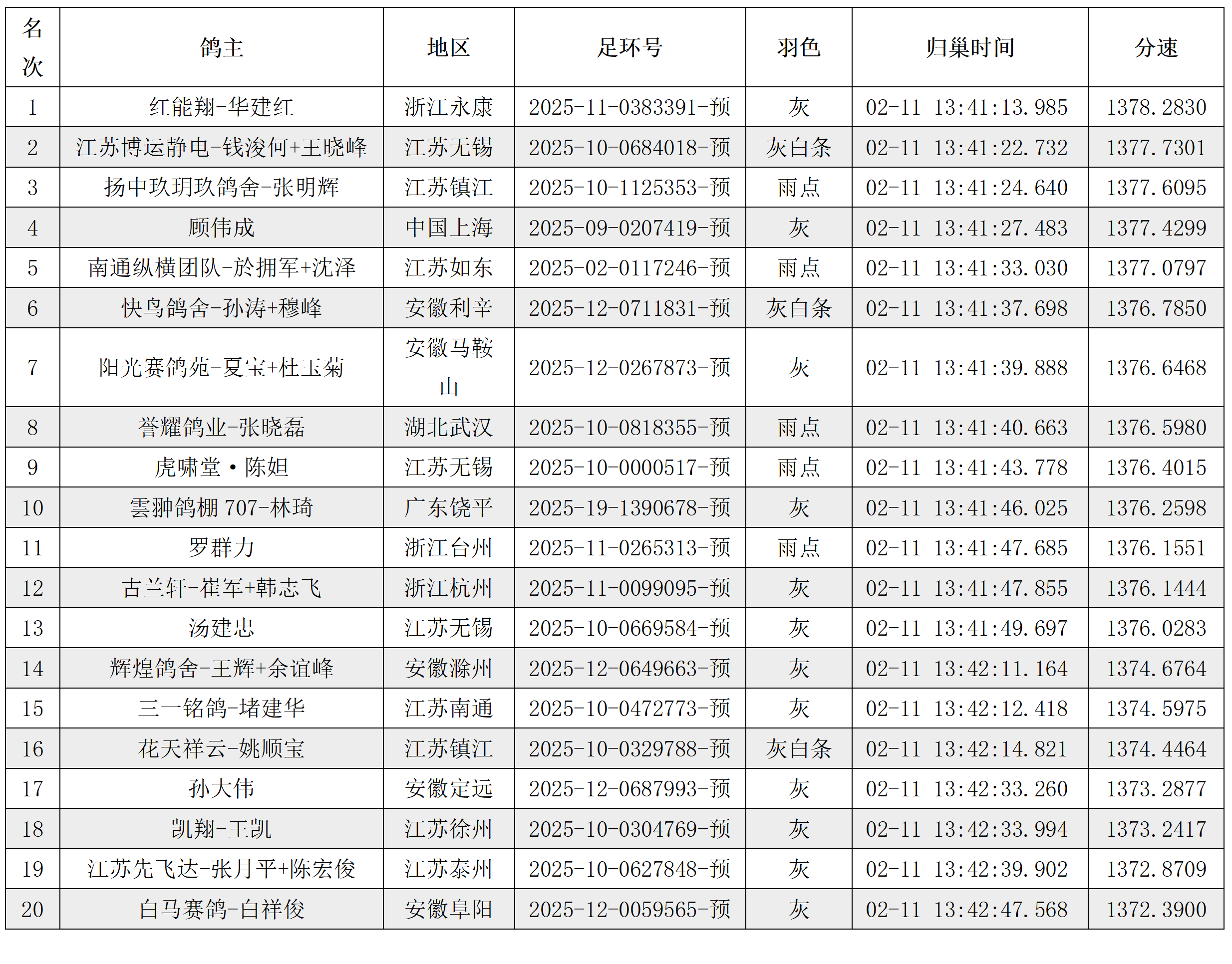 浙江永康红能翔-华建红麾下悍将11-0383391灰、以1378.2830米/分勇夺决赛冠军、并揽精英赛冠军,成为双冠王。