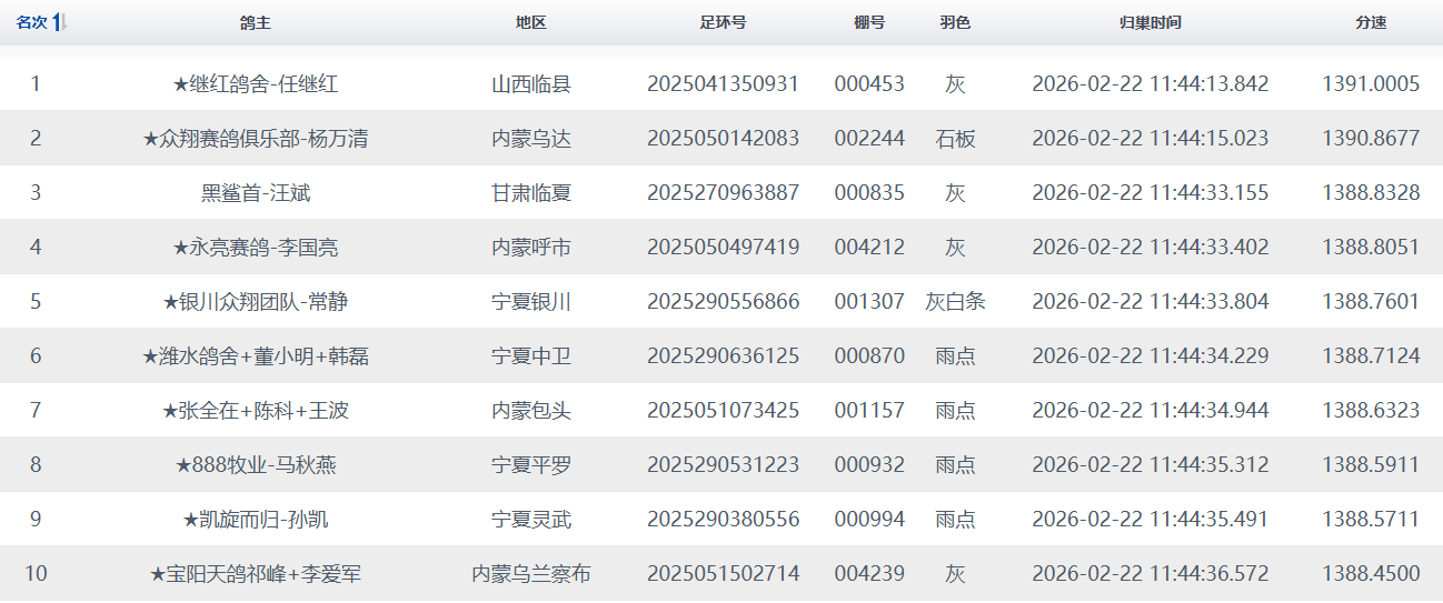 上午11时44分13秒,鸽友继红鸽舍任继红的一羽2025041350931率先踩钟进棚,羽色灰,分速1391.0005米/分,斩获一关冠军。