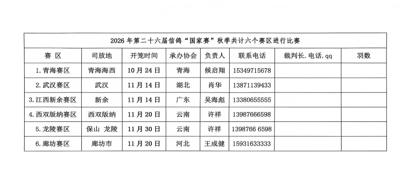 近日,2026年第二十六届信鸽国家赛日程已经公布,春季竞赛将于4月启动。竞赛项目分为短距离国家赛A、短距离国家赛B、中距离国家赛A、中距离国家赛B、中长距离国家赛A、中长距离国家赛B、长距离国家赛A、长距离国家赛B等多个赛项。