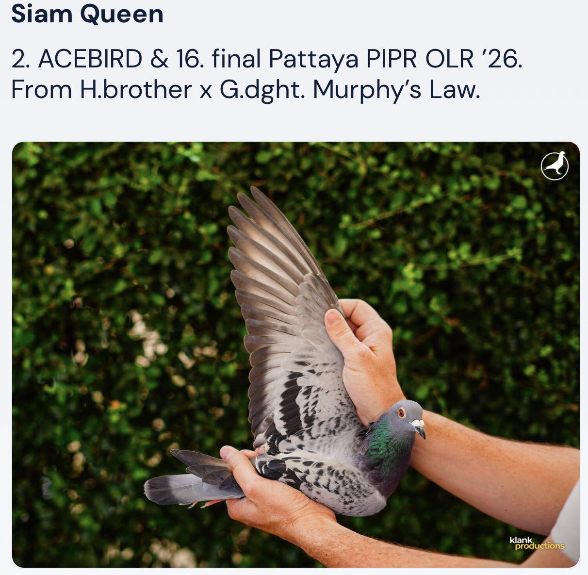 这羽鸽王亚军的血脉底蕴尤为深厚,根植于有“荷兰巨炮”之称的威廉迪布恩核心血脉,是当家种雄、四获鸽王冠军的“墨菲定律”及其同父弟弟的近亲作育,更是奥林匹克名鸽“飓风号”的双重回血结晶。其父亲是“墨菲定律”的同父弟弟,源自墨菲定律父亲赫尔曼与玛莉安娜027的结合,赫尔曼自身曾斩获南图17186羽亚军,玛莉安娜027则是奥林匹克飓风外孙女,自身亦有19年SS当日归长距离鸽王季军的亮眼战绩;母亲则是“飓风号”直孙与“墨菲定律”直女两大王牌血系的顶级融合,实战基因与生俱来,这也正是它能在全球顶尖赛事中脱颖而出的关键所在。