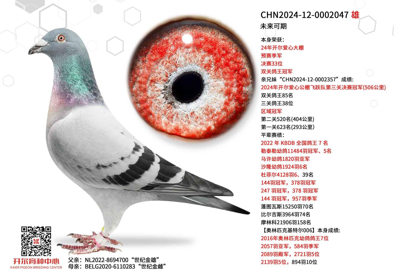 母亲,则源自凡登布克血系精华,融合奥林匹克006与基特尔两代速度体系。基特尔,2013年KBDB全国短距离幼鸽王冠军;其亲兄弟格里佩,同列全国6名。奥林匹克006,2021年KBDB全国速度鸽王冠军;亲兄弟自由号,荣膺帝恩联盟魁夫兰幼鸽鸽王冠军。同样是兄弟联袂,跨越时空,与未来可期、世纪希望在赛场彼端遥相呼应。