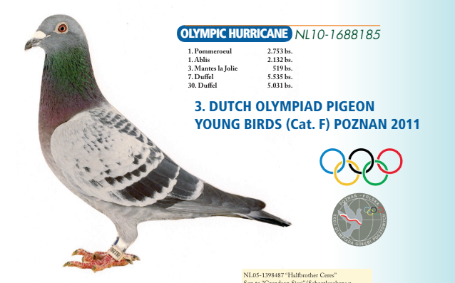 兄弟二人的父系根植于威廉·迪布恩麾下的传奇铭鸽——奥林匹克飓风号。飓风号,TBOTB 全国幼鸽鸽王季军,奥林匹克荷兰代表鸽季军,全国王者之王幼鸽王季军;进入种鸽舍之后,更作育后代斩获50余项鸽王级荣耀,是真正写进欧洲赛鸽史的核心种源。