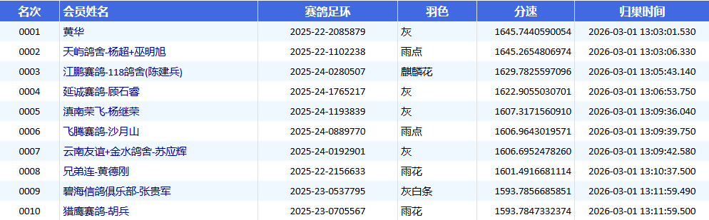 下午13时03分01秒,首羽赛鸽高速归巢。鸽友黄华的一羽2025-22-2085879灰鸽,分速1645.7440米/分拿下冠军。五秒后,亚军鸽接着报进,鸽主为天屿鸽舍-杨超+巫明旭,环号2025-22-1102238雨点,分速1645.2654米/分。13时05分,江鹏赛鸽-118鸽舍(陈建兵)的2025-24-0280507麒麟花报进,分速1629.7825米/分,获得季军。截至开笼第二日上午10时40分,共报进2177羽赛鸽,归巢率31.82%。