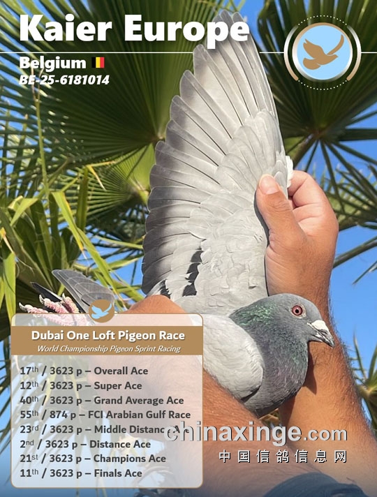 也正是基于这份信念的支撑,开尔不仅在国内建立赛场、开展信鸽公益,推动信鸽运动发展,并且也在比利时建立种鸽舍,以欧洲赛场为支点,使开尔赛鸽影响趋向国际化。其实在开尔还未到迪拜参赛之前,开尔种鸽就已经进入了中东地区并小有名气。自2024年迪拜公棚沙漠赛起飞以来,开尔赛鸽连续拿下该赛事的王中王联赛冠军、鸽王亚军和鸽王殿军,开尔作为中国赛鸽的一块品牌,以出色的比赛能力,又赢得世界一方鸽友对中国信鸽的尊重!