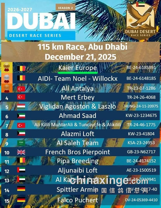 中东赛线全是沙漠,再加上恐怖的高温和无处可觅的水源,350公里级的比赛在中东几乎就是赛鸽的极限了。因此迪拜公棚沙漠赛专注于短距离比赛的目的是因地制宜,我们无可评说。不过有一点可以肯定的是:迪拜公棚沙漠赛虽然体量不大,但非常注重国际性,每一场比赛排名都有国旗标识,参赛鸽友主要来自于中东地区和欧洲,也有南非、埃及、墨西哥、加拿大、印度、菲律宾等数十个国家和地区鸽友参赛。虽然开尔的参赛名称为“Kaier Europe(开尔欧洲)”,地区标识是比利时国旗,但所有参赛鸽友都知道这支赛鸽战队属于中国,其所获得的荣誉也属于中国。