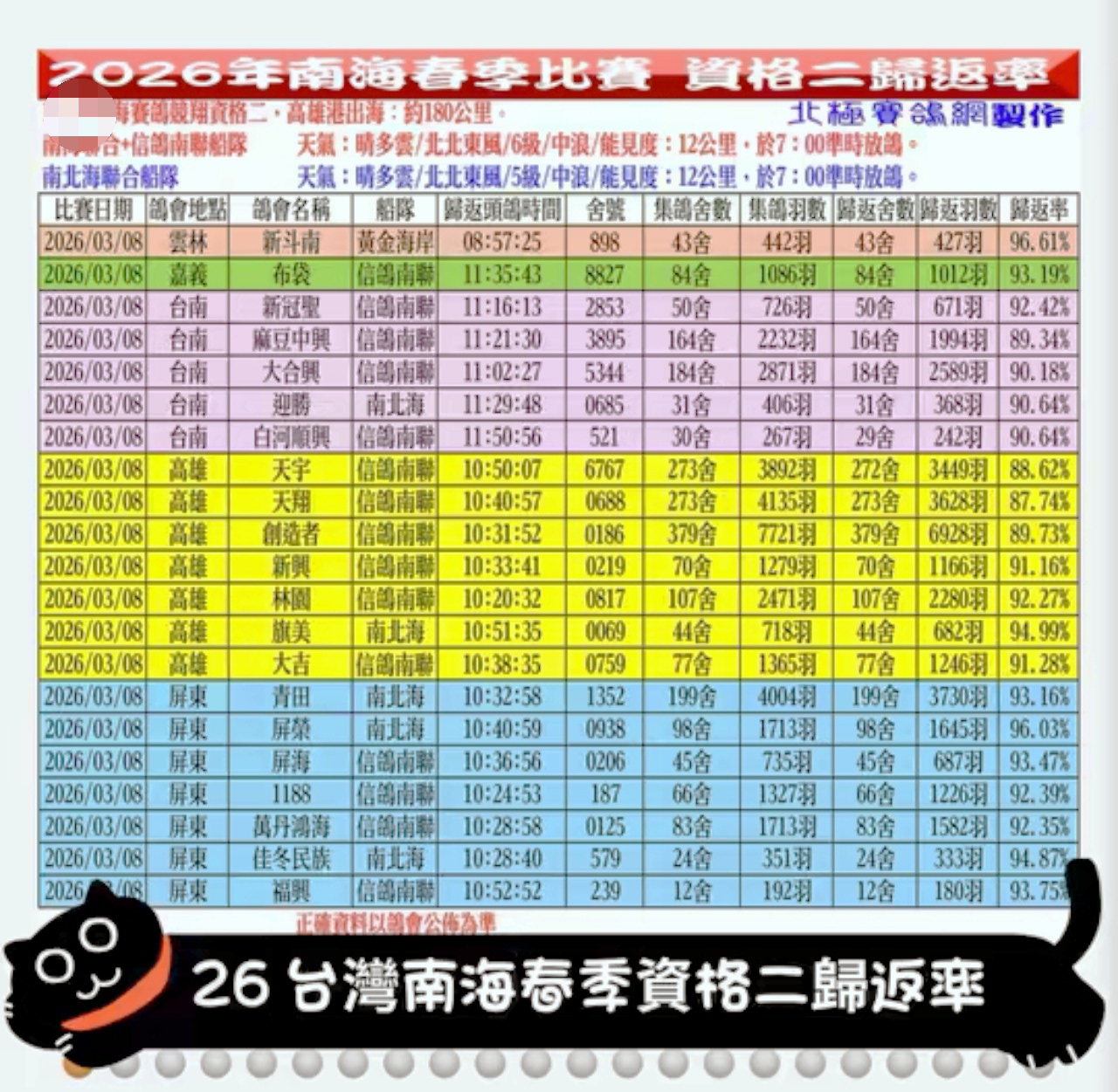 据统计,此次比赛汇聚了20家鸽会,共计39204羽赛鸽同场竞技。历经两个多小时的奋力翱翔,赛鸽陆续凯旋。继首场资格赛创下85%的归巢率后,本场赛事再传捷报,总归巢率攀升至90.84%,共有35613羽成功归巢。其中,冠军分速984.813米/分,来自屏东地区屏荣鸽会。