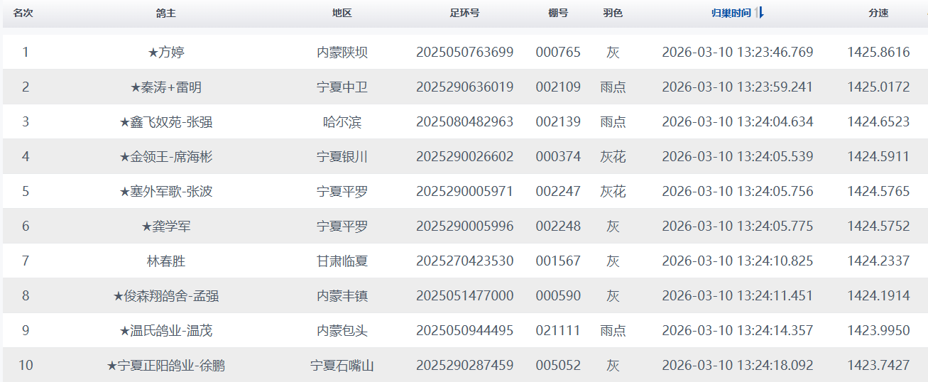 13时23分46秒,内蒙鸽友方婷的一羽2025050763699灰鸽率先踩钟报进,分速1425.8616米/分,斩获本次决赛冠军!