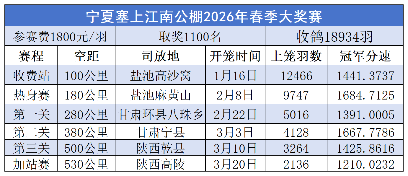 宁夏塞上江南公棚2026年春赛,已经举办了十四届。今年参赛费1800元/羽,收鸽18934羽。经过多次家飞训放,赛事自1月百公里收费站启幕,上笼12466羽,归巢11630羽,93.29%的归巢率展现鸽群卓越素质;180公里热身赛中,红蓝战队任建国爱鸽以1684.71米/分的速度拔得头筹。2月22日,一关在甘肃环县八珠乡打响。继红鸽舍任继红的2025041350931斩获冠军。3月3日,第二关比赛在甘肃宁县开笼,空距392公里,十七赛鸽-党海宇的2025270001377获得冠军。