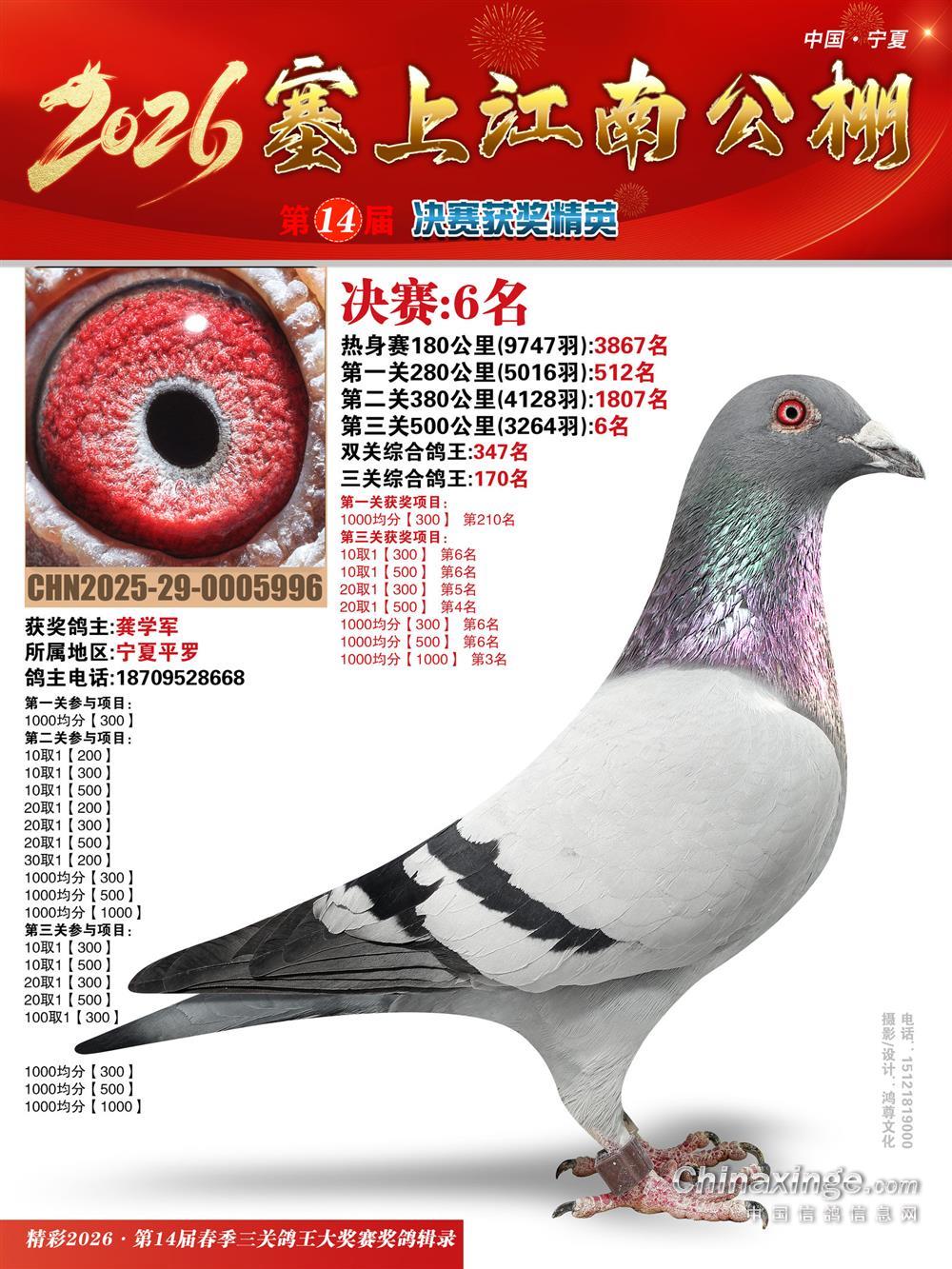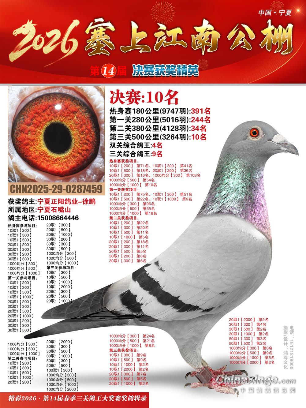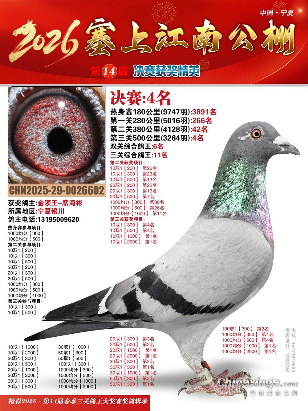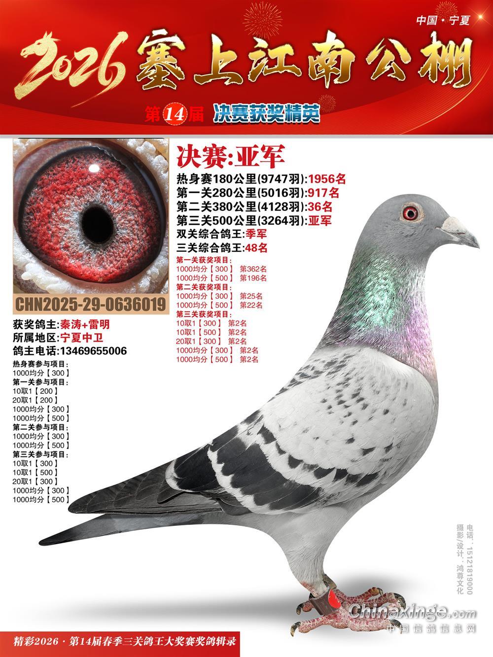 三月春风吹塞上,黄河之滨战鼓响。宁夏塞上江南赛鸽公棚2026年春季大奖赛于近期圆满落幕。本届赛事收鸽18934羽,参赛费1800元/羽,历经几个月的层层淬炼,3264羽精英战鸽在500公里决赛中展开巅峰对决,最终内蒙鸽友方婷的一羽2025050763699灰鸽斩获决赛冠军。飞翔鸽舍-张永胜麾下一羽2025051031259灰鸽斩获三关鸽王冠军。而东方赛鸽-马庆发的一羽红轮鸽2025290019975更是荣耀加身,斩获三关鸽王季军与双关鸽王亚军,为西北赛鸽界再添华彩。
