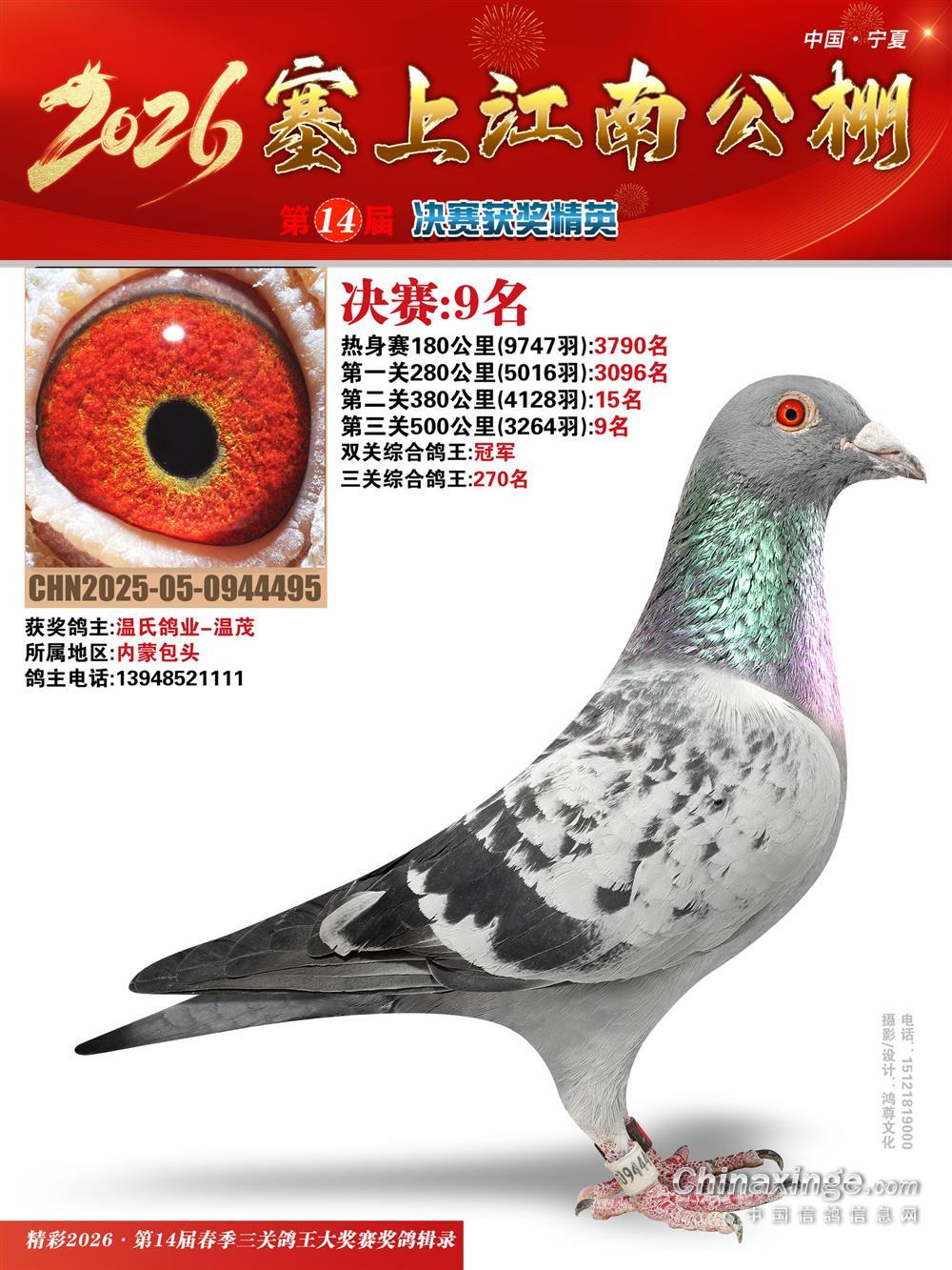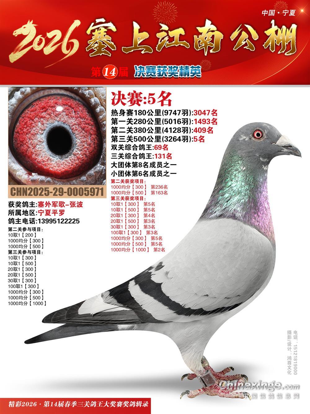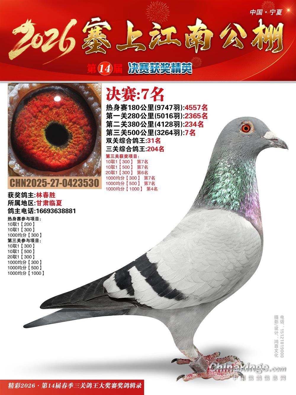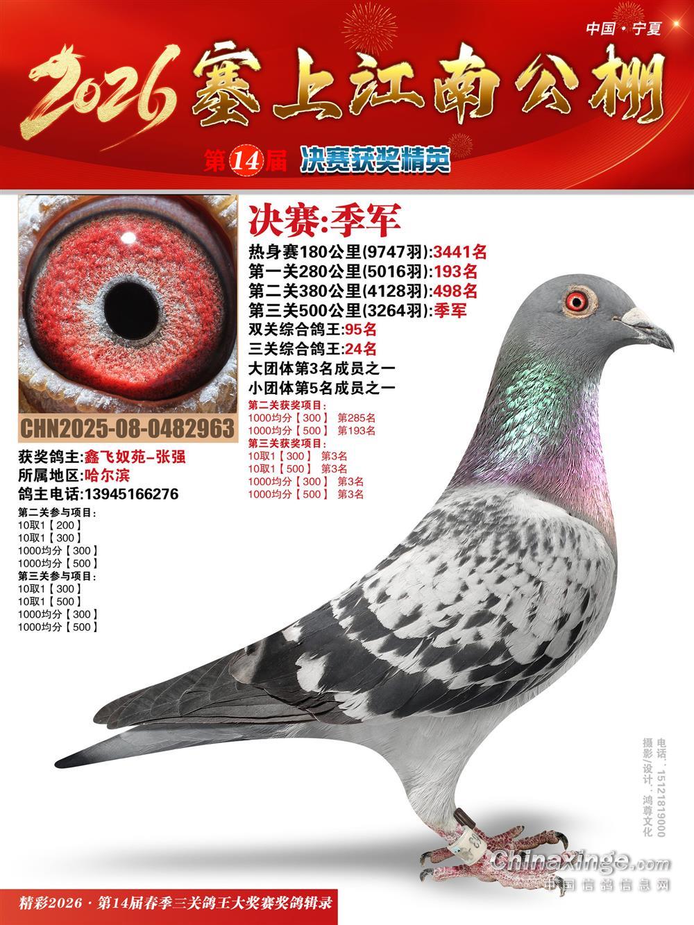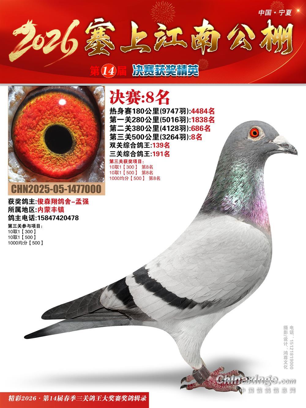 三月春风吹塞上,黄河之滨战鼓响。宁夏塞上江南赛鸽公棚2026年春季大奖赛于近期圆满落幕。本届赛事收鸽18934羽,参赛费1800元/羽,历经几个月的层层淬炼,3264羽精英战鸽在500公里决赛中展开巅峰对决,最终内蒙鸽友方婷的一羽2025050763699灰鸽斩获决赛冠军。飞翔鸽舍-张永胜麾下一羽2025051031259灰鸽斩获三关鸽王冠军。而东方赛鸽-马庆发的一羽红轮鸽2025290019975更是荣耀加身,斩获三关鸽王季军与双关鸽王亚军,为西北赛鸽界再添华彩。