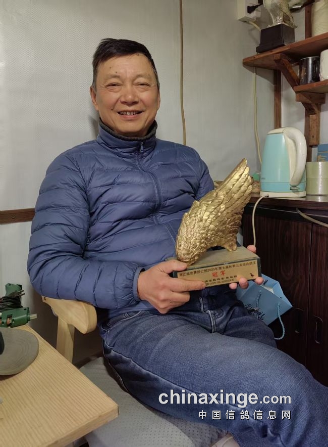 陈敏俊手捧单关冠军飞鸽纪念品