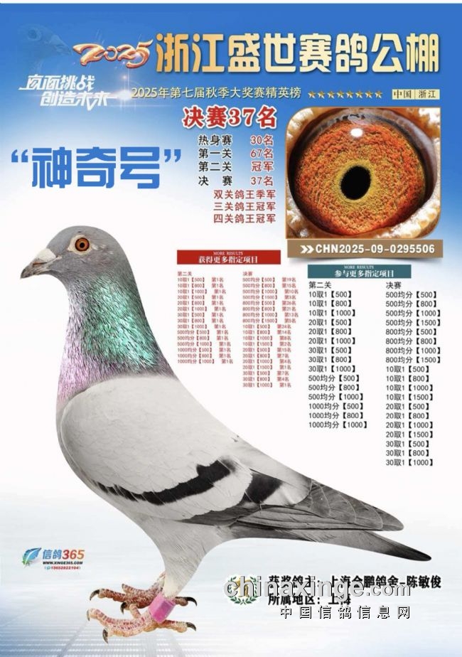 10、浙江盛世公棚“神奇号”:热身赛30名、一关67名、二关冠军、三关(决赛)37名,三关鸽王冠军、四关鸽王冠军;