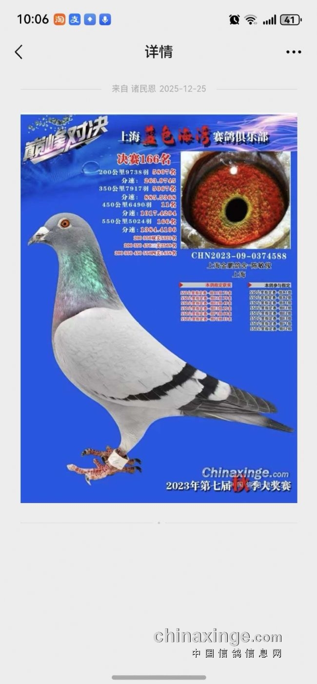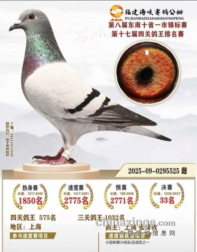 CHN2025—09—0295506灰黄“神奇号”,其父鸽是“蓝湾166”灰黄(上海蓝湾公棚预赛11名、决赛166名),其母鸽是“三关5”灰砂(借鸽友胡志山,上海普陀区三关特比赛鸽王5名),陈采用的是“强强联手”+“互补配对”的增效原理:雄二关高位+雌三关关高位、小雄配大母、黄眼配砂眼、短体型配稍长体型等,收到了神奇的育种效应。
