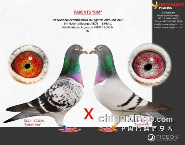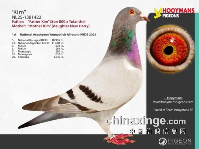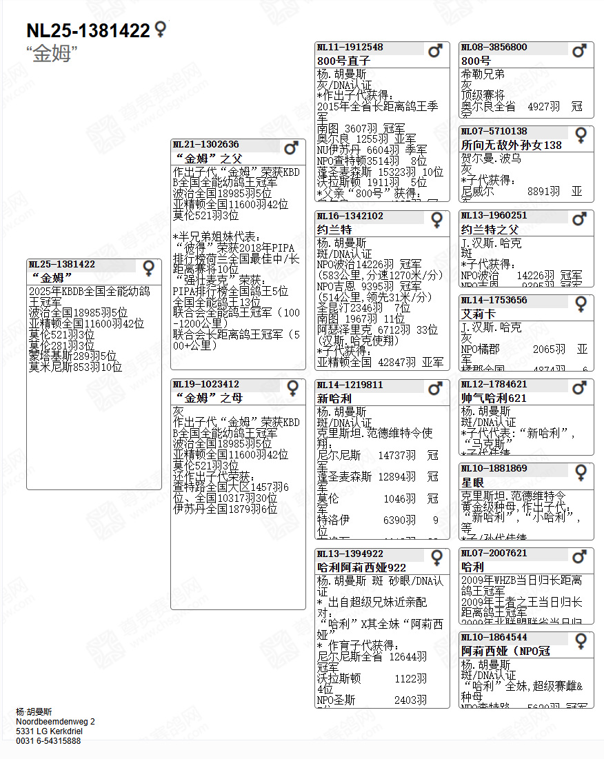 2024年,荷兰赛鸽名家杨·胡曼斯(Jan Hooymans)凭借“柯丽”(Corrie),以史上最低系数斩获KBDB全国大中距离一岁鸽王冠军。2025年再凭“金姆”(Kim)拿下KBDB全国全能幼鸽王冠军,实现鸽王冠军两连冠。两羽冠军鸽均为 “新哈利” 外孙女。新科鸽王冠军“金姆”,是一羽极具智慧的灰黄眼雌鸽。父亲NL21-1302636,雨点黄眼雄,源自迪克·凡戴克“所向无敌”与汉斯·哈克两大顶级鸽系。母亲NL19-1023412,灰砂眼雌,出自“新哈利”配“哈利”与“阿莉西娅”的直女,采用“哈利”直孙配直女的极致近亲作育手法,最大化保留了核心血系的优良特质。