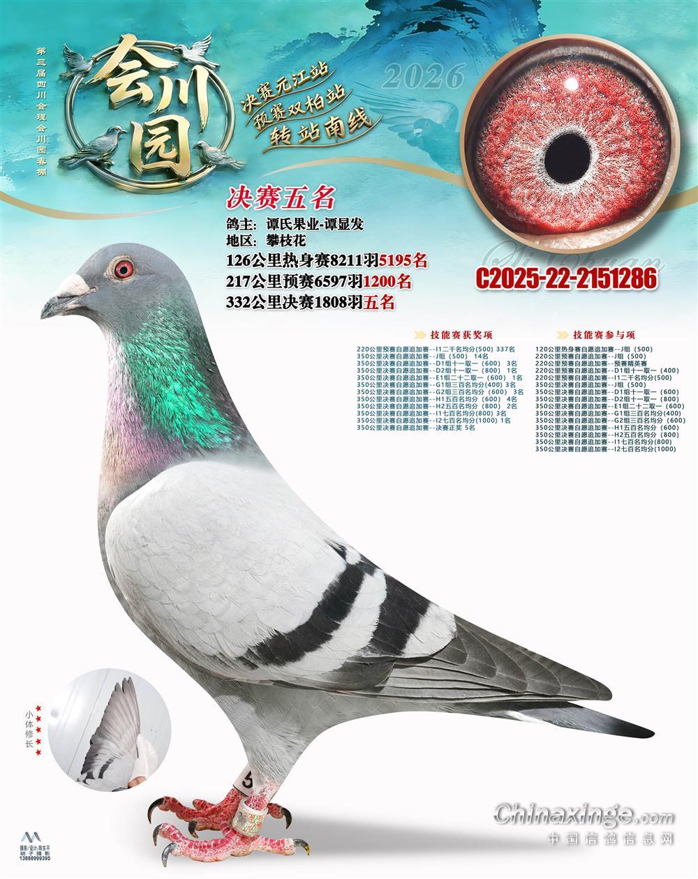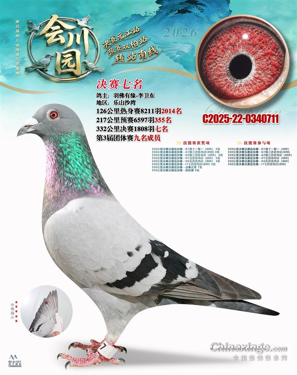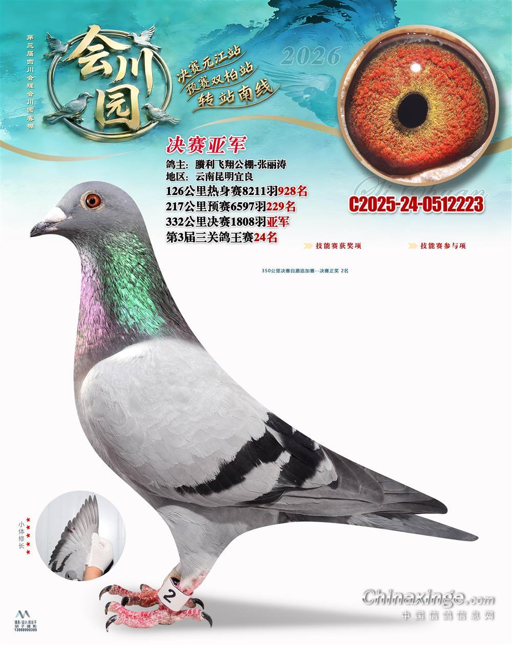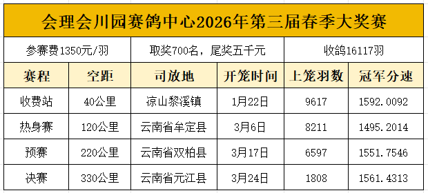 从云南到四川,一条翻山跨江、天敌环伺的挑战赛线,被会理会川园小将们拿下,生生飞出一场关于勇气、坚韧的不朽传奇。四川会理会川园赛鸽中心第三届春赛,收鸽1.6万羽,最终仅有千羽赛鸽摸到决赛门槛。每次出征,小将们都要面对突袭的峡谷乱流、局部降雨、多变的气温。从热身赛120公里到决赛330公里,能飞到决赛,已然是实力的证明,含金量不必多说。最终冠绝三关的,是攀枝花鸽友裂谷神鹰-吴小蓉的2025-22-2150848,三关成绩都在上游:一关220名、二关25名、三关57名。决赛冠军宣先鸽舍-汤宣平+罗立新的2025-22-2013375灰,则是一名厚积薄发的种子选手,热身赛还在六千名开外,决赛已经一鸣惊人拿下冠军,祝贺鸽主!