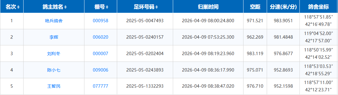 7时52分25秒,鸽友李辉的一羽2025-05-0240157成功报进,空距962公里,分速981.4848米/分,登上亚军宝座。