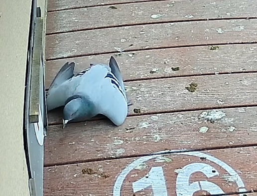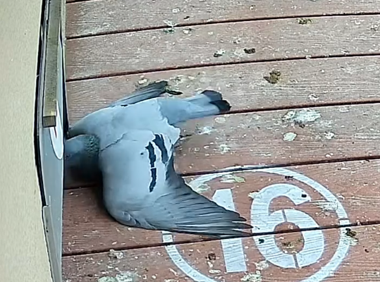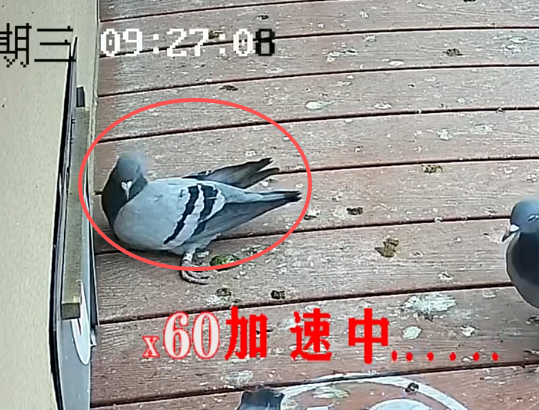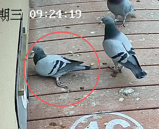 这羽赛鸽环号01-1085229,当它出现在监控镜头中时,已经是两腿骨折、腹部也有擦伤。开笼第二天早上9点24分掉落在降落台上之后,仍旧用翅膀扑棱着向前移动。
