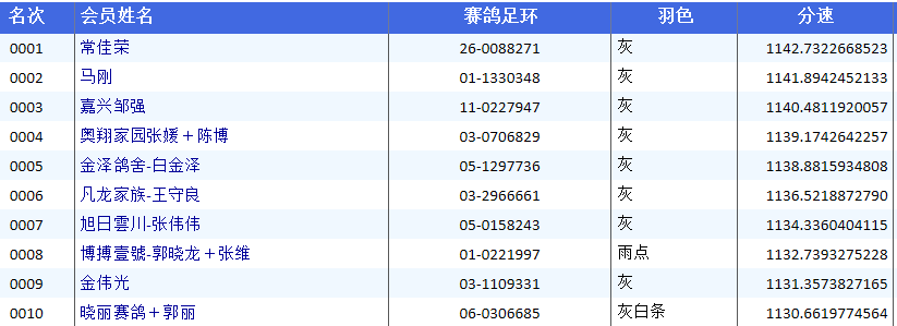 殿军由鸽友奥翔家园张媛+陈博的03-0706829灰拿下,分速1139.1742米/分。