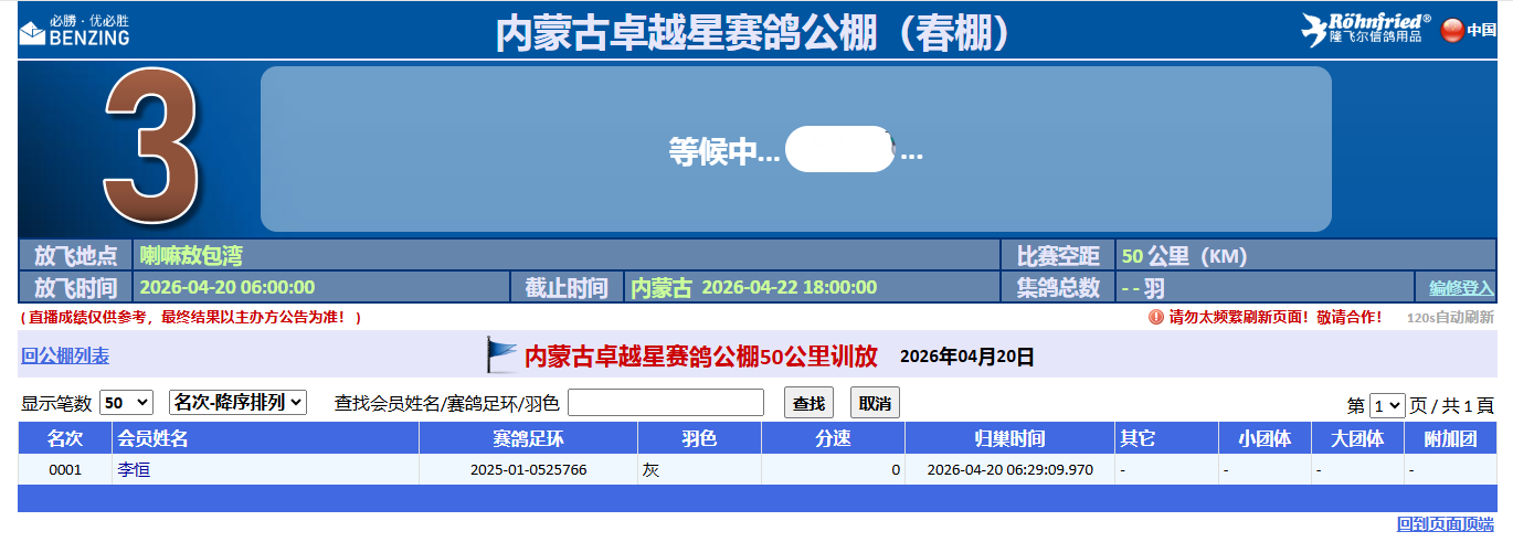 4月20日早6点,内蒙古卓越星赛鸽公棚(春棚)开启50公里短训,在喇嘛敖包湾放飞。截至下午16点10分,整整过去10小时,仅有来自李恒鸽友名下2025-01-0525766灰鸽归巢。 天气预报显示,放飞点喇嘛敖包湾天气晴朗,气温5-15℃,午后风力最强,阵风可达8级。点击查看直播>> 根据此前4月6日30公里训放后的归巢统计,该公棚存棚赛鸽数量为6048羽。2026年为该公棚首届春赛,收鸽14396羽。首届设参赛费1800元/羽,开奖羽数6000羽。其中,决赛取奖1100名。